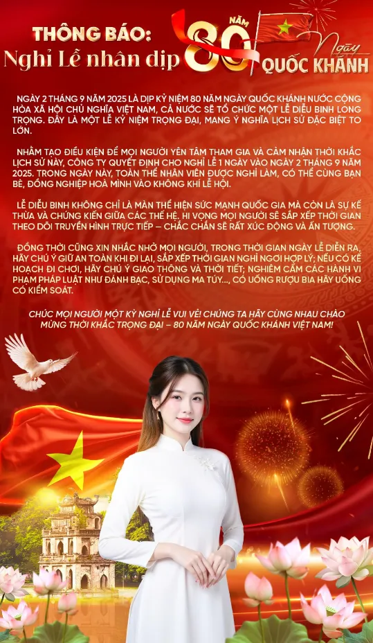 Chúc toàn thể cán bộ nhân viên và gia đình có một kỳ nghỉ lễ vui vẻ, an toàn và ý nghĩa. Hãy cùng nhau đón chào thời khắc trọng đại – 80 năm Quốc khánh Việt Nam!